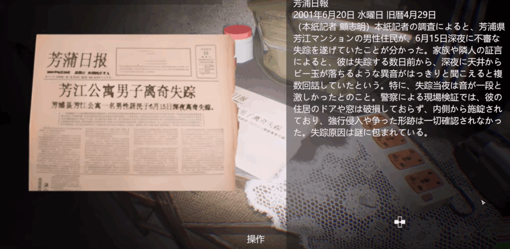 主人公が廃墟へ足を踏み入れると、不気味なことにまだ電気が通っているではありませんか。すでに住民も居ないアパートなのに何故?主人公は疑問を感じながらも、それほど躊躇することなく簡単に建物を探索します。204号室で宿泊することになっていた主人公は部屋に入ると、荷物を置いて部屋を簡単に片づけると、調査に向けて一休みすることにしました。