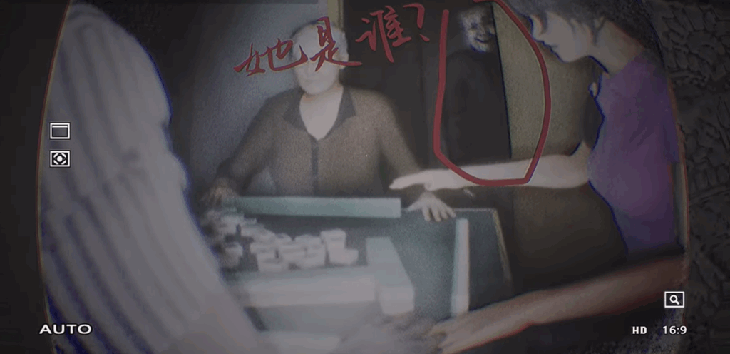 主人公も夜中に聞こえたビー玉の音を頼りに建物を探索している途中で老婆の姿を目撃しており、その後異形化した老婆に追いかけられています。