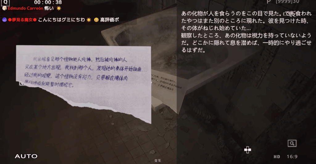 ある部屋で見つけた書類には、『お婆さんがいつも見ていて怖い』という子供の日記のようなものがありました。また、近くには住民が写った写真の中に不気味に佇む老婆の様な影がありました。