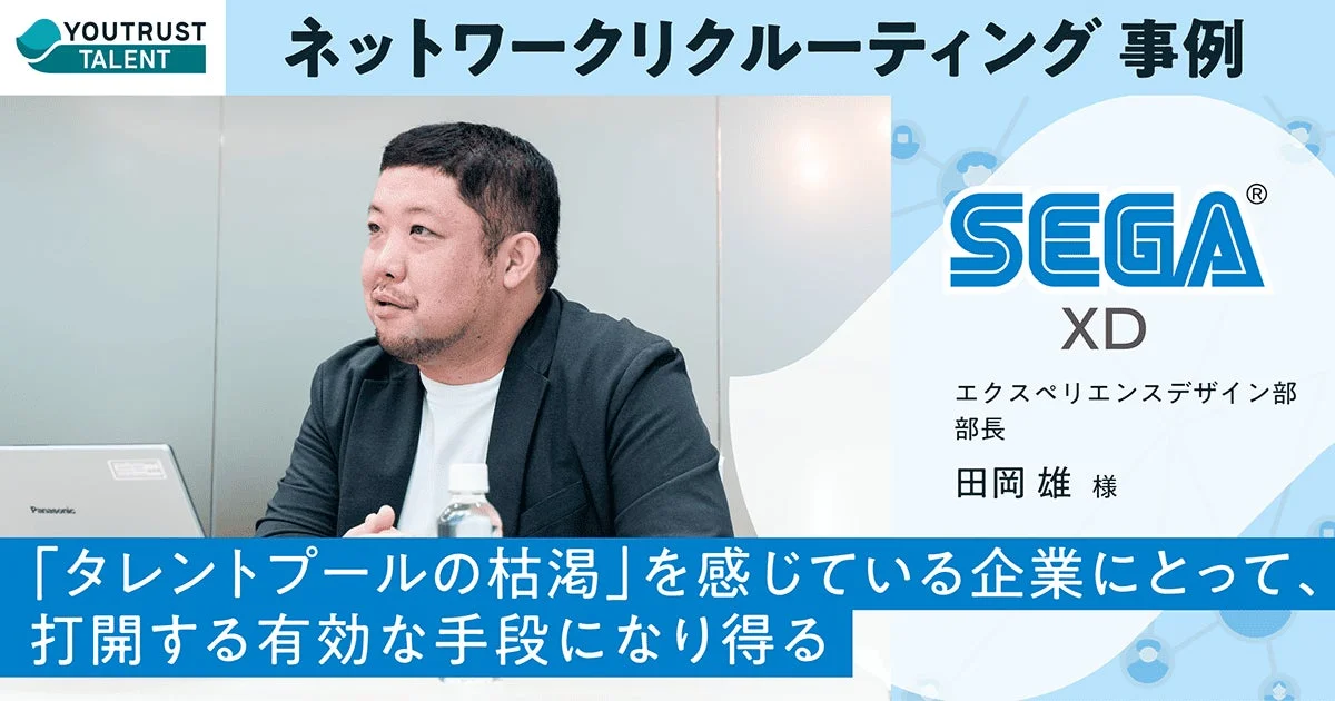 セガ エックスディーのエクスペリエンスデザイン部 部長であり事業人事責任者を務める田岡雄氏は、採用活動における課題意識から、新しい媒体や手法を模索する中で「YOUTRUST TALENT」に注目したと述べています。社員のつながりを活用する「ネットワークリクルーティング」というユニークな手法に、「とにかく新しいことをやってみよう」というスタンスで導入を決定したそうです。