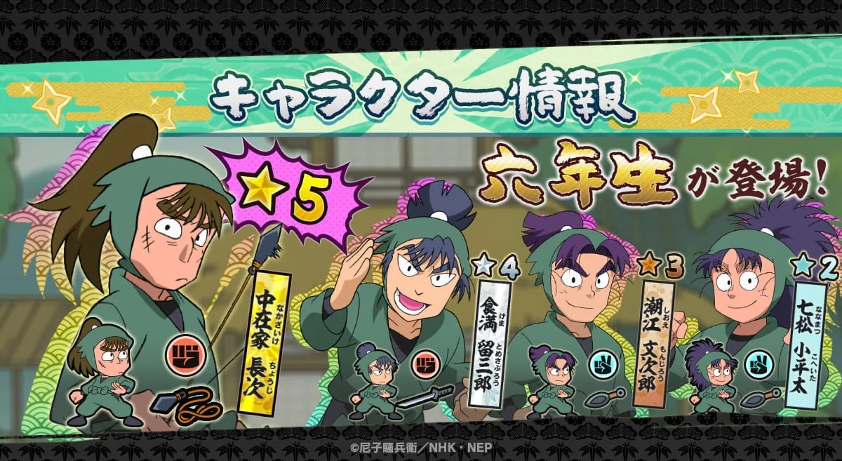 2026年3月23日(月)のメンテナンス後より、新規追加キャラクターとして「六年生」メンバーの4名が登場しています。プレミアムガチャでは「★5中在家長次(縄鏢)」、「★4食満留三郎(刀)」、「★3潮江文次郎(くない)」が、ノーマルガチャでは「★2七松小平太(くない)」がそれぞれ登場しました。