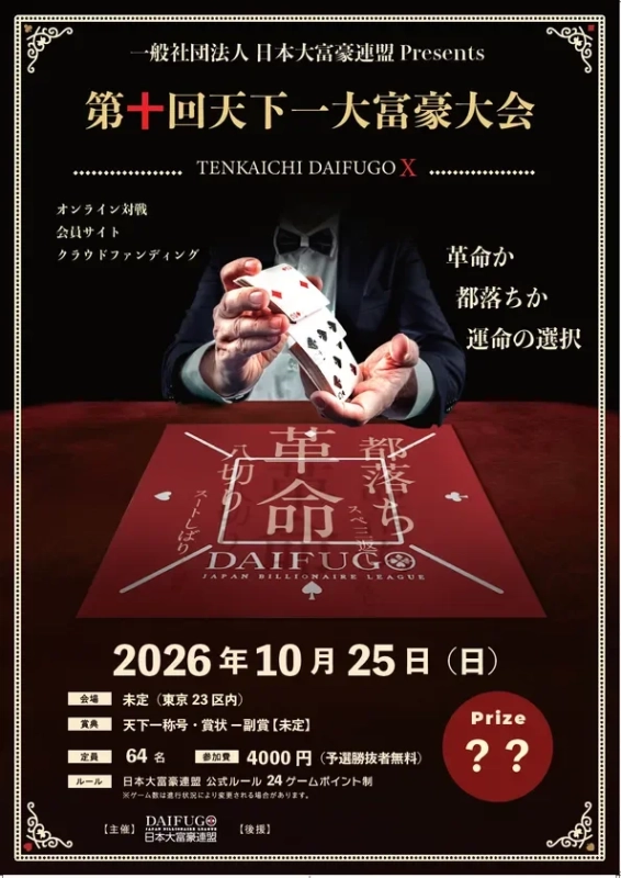 代表理事の立入 勝義氏は、「大富豪は、世代も職業も超えて同じテーブルで笑い合えるゲームです。そして公式ルールで競えば、勝負の場には確かに“ドラマ”が生まれます。第十回記念大会は、運営だけの挑戦ではありません。これまで支えてくださった皆様、初めて知ってくださる皆様、スポンサーとして背中を押してくださる皆様とともに、『みんなで作る天下一』にしたい。どうかこの節目に、あなたの一手を貸してください」とコメントしています。