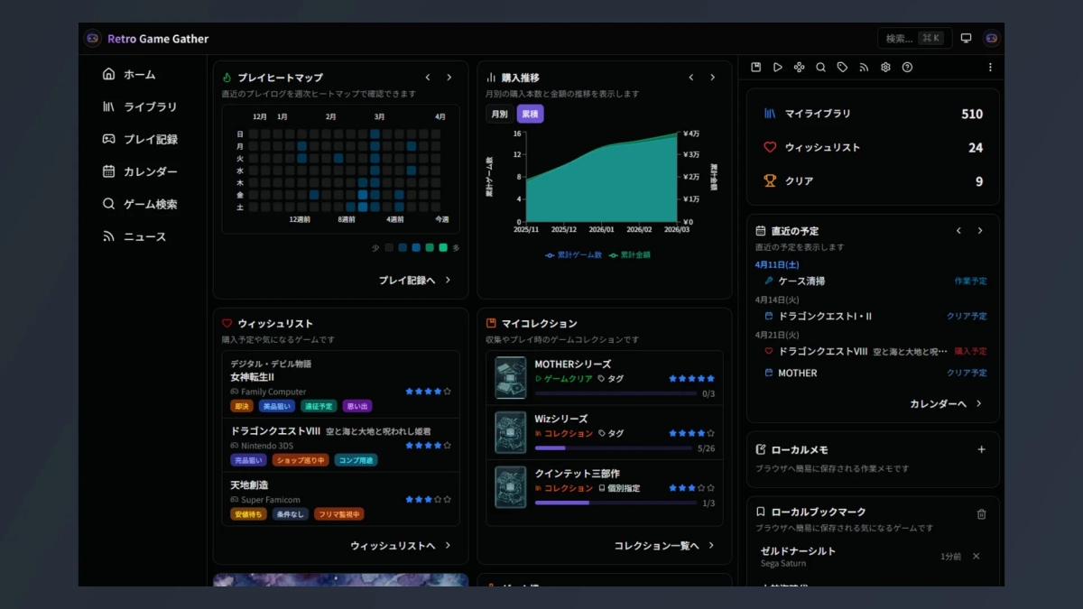 ゲーム詳細や一覧の操作から、ブラウザ内に一時的にゲームを保持する「ローカルブックマーク」が追加されました。あとでまとめて見返したいタイトルを手早く置いておき、ブックマーク一覧から該当ゲームへすぐ戻れます。クラウドへは保存されないため、端末をまたいだ共有はできませんが、ちょっと気になった時の手軽な記憶手段として利用できます。